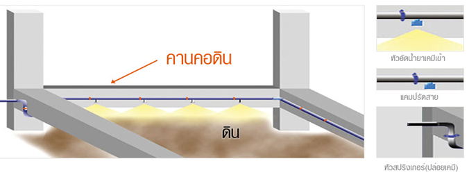 - หลังจากการวางท่อและทดสอบประสิทธิภาพแล้ว ทางบริษัทฯ จะดำเนินการอัดและพ่นน้ำยาเคมีลงดิน ให้ครอบคลุมพื้นที่ทุกตารางเมตร เพื่อการป้องกัน และกำจัดปลวกใต้ดิน ที่มีประสิทธิภาพ ก่อนการเทพื้น คือ การป้องกันและกำจัดปลวกใต้ดินที่มีประสิทธิภาพด้วยการอัดและพ่นน้ำยาเคมีลงดิน ครอบคลุมพื้นที่ทุกตารางเมตร